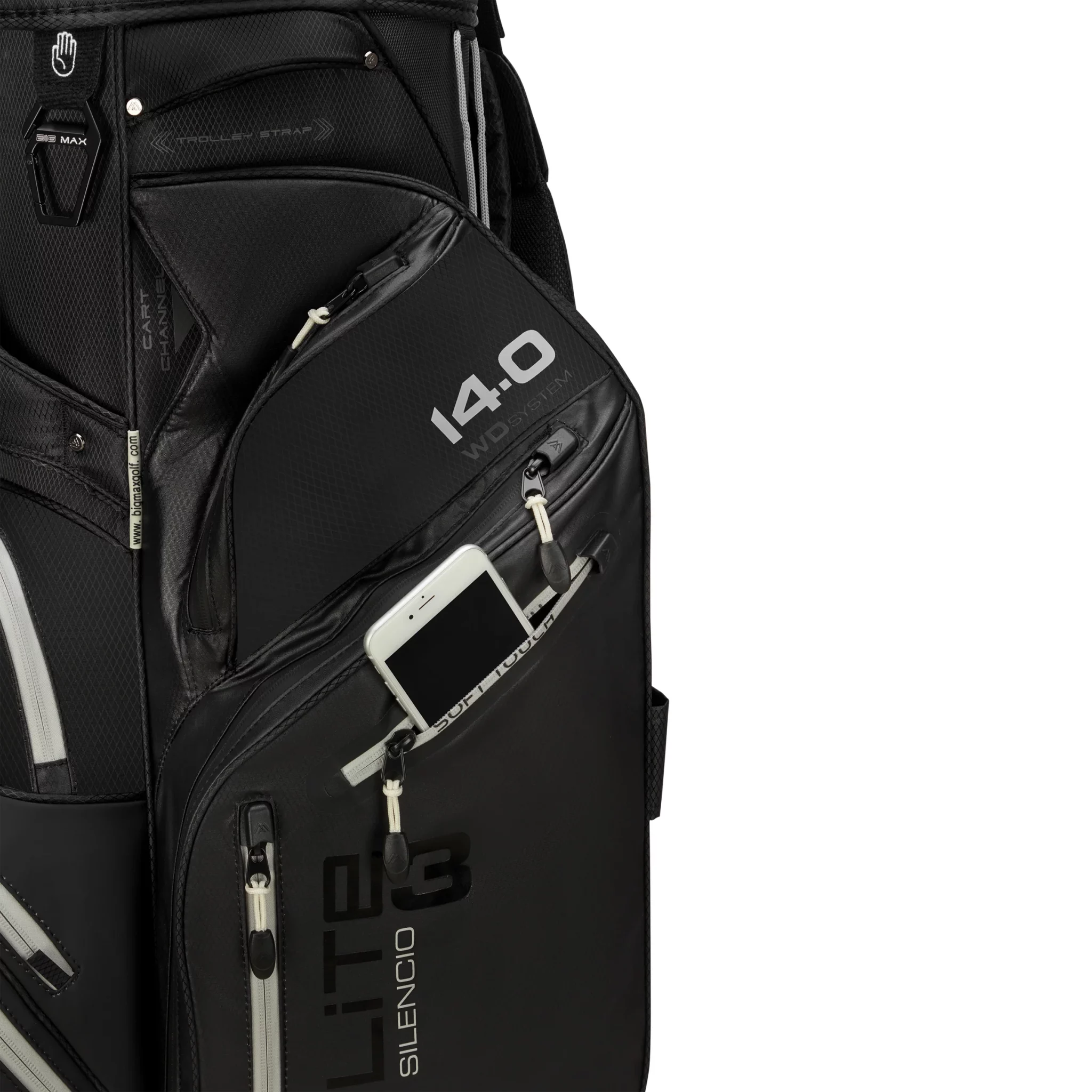 The Dri Lite Silencio 3 combines a 14-way Silencio top that prevents club rattling with a fresh, premium look. Made from durable nylon and Soft Guard PU, it features two seam sealed zips and waterproof materials to keep your gear dry in any weather. Smart upgrades include a newly designed zinc towel hook with integrated bottle opener, a second hook for added versatility, and an external tee holder. Integrated trolley and cart straps ensure a secure fit, while a mesh organiser in the ball pocket and internal dividers in the side pockets keep everything neatly in place.
