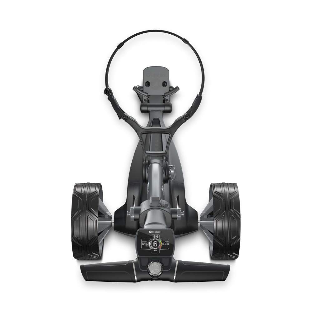 Other features include an integrated safety cut-off system; an auto-open stand mechanism; a new tubular frame design for better grip stability; plus the exclusive Motocaddy EASILOCK™ bag/trolley connection system, eliminating the need for a lower bag strap.